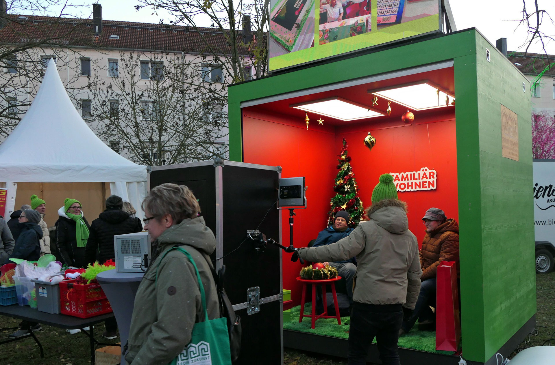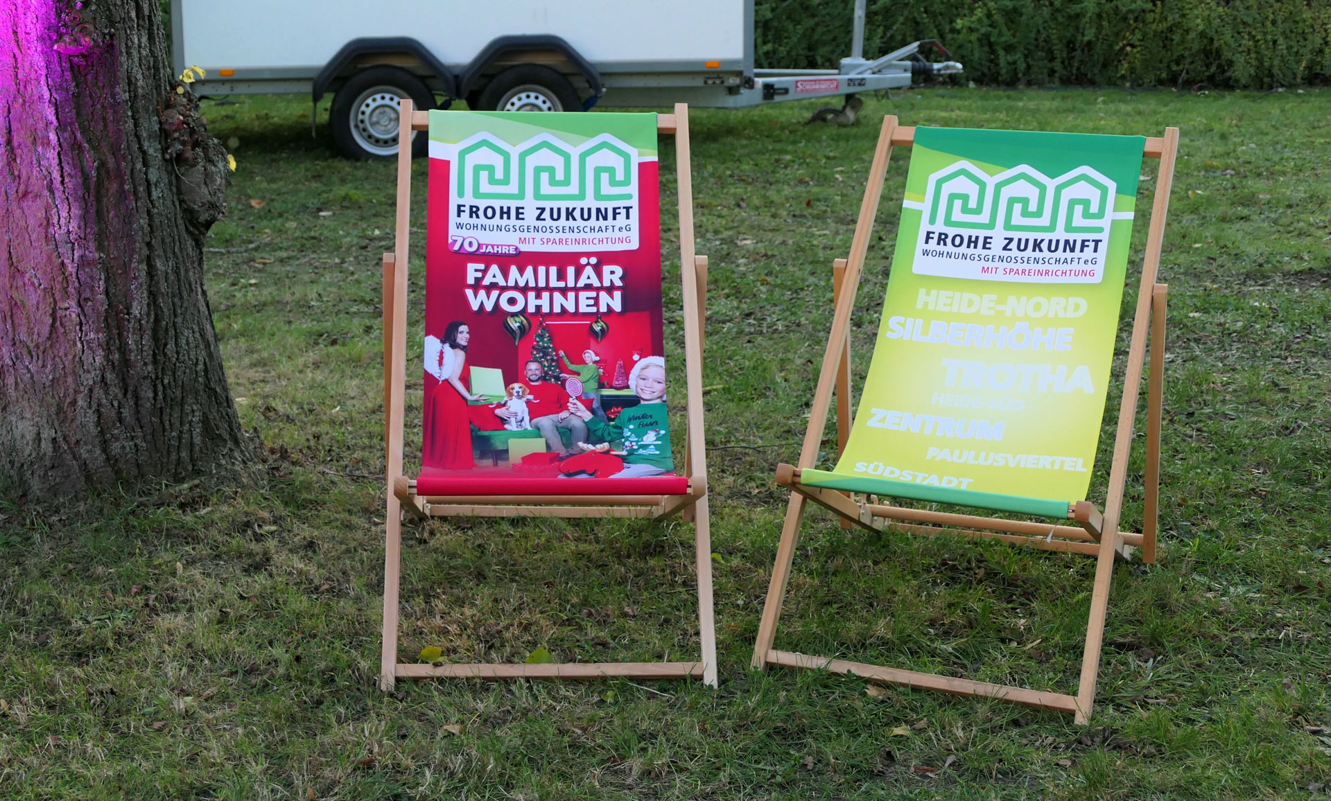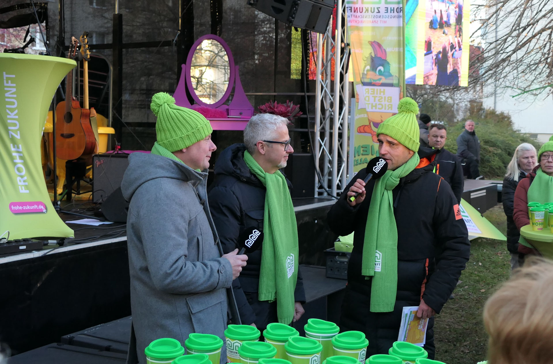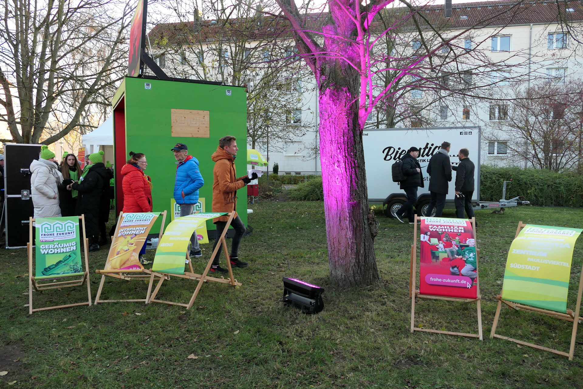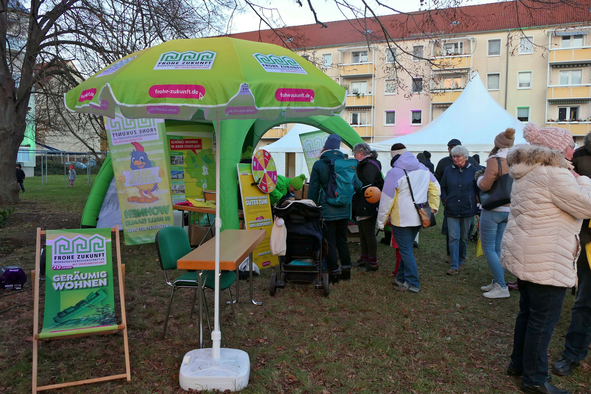 Das ganze Jahr 2024 über war die FROHE ZUKUNFT Wohnungsgenossenschaft eG mit einem riesigen Würfel und knallbunten Wohnwelten samt Models in der gesamten Stadt unterwegs und kam zu ihren Bewohnern nach Heide-Nord, Heide-Süd, Trotha, in die Silberhöhe, Südstadt, Frohe Zukunft, ins Paulusviertel und ins Zentrum. Alle Mitglieder feierten mir und freuten sich auf Kaffee, Kuchen, Spiel & Spaß mit Präsenten für Groß und Klein! Das Programm wurde von den Mitarbeitern der Genossenschaft in Eigenregie organisiert – alle Mitarbeiter aus der Verwaltung engagierten sich. Maskottchen Gustav Sparfroh war natürlich stets mit dabei. Zum Andenken gab’s auf Wunsch für jeden Geburtstagsgast ein Erinnerungsfoto aus der Jubiläums-Fotobox.