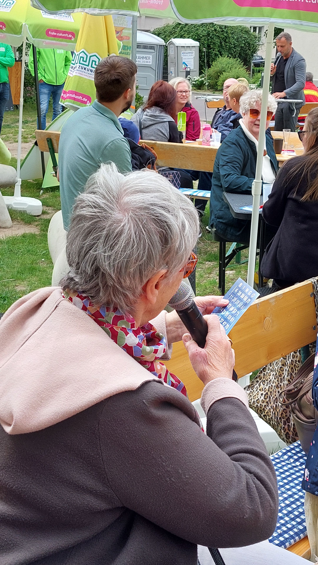 Beim BINGO waren alle Bewohner mit Begeisterung dabei. Es gab zwei Gewinnerinnen. Beide schnappten sich somit einen FROHE ZUKUNFT-Überraschungsbeutel mit einem Einkaufsgutschein. Dafür gab es sogar Standing Ovation. 🎉