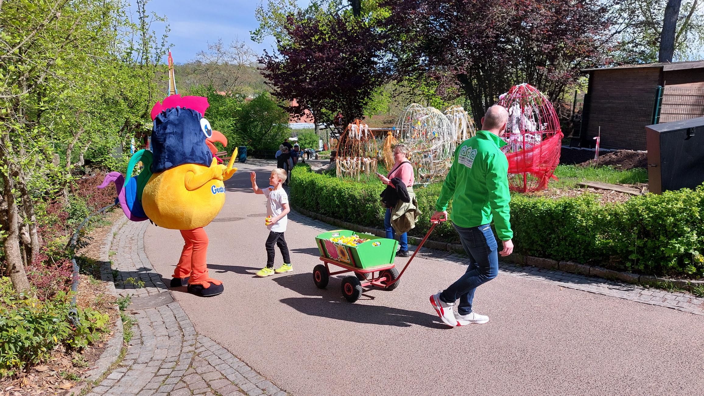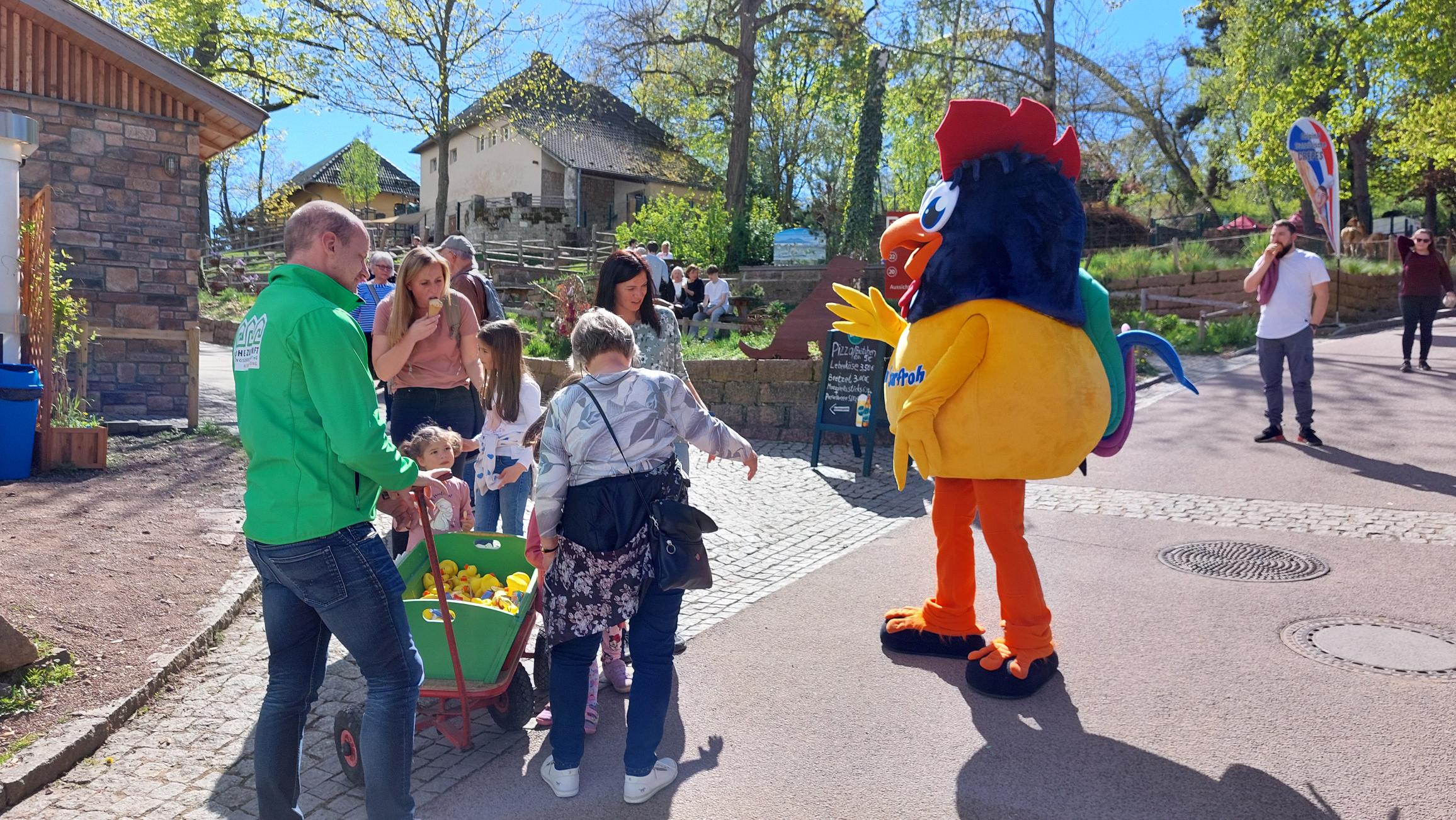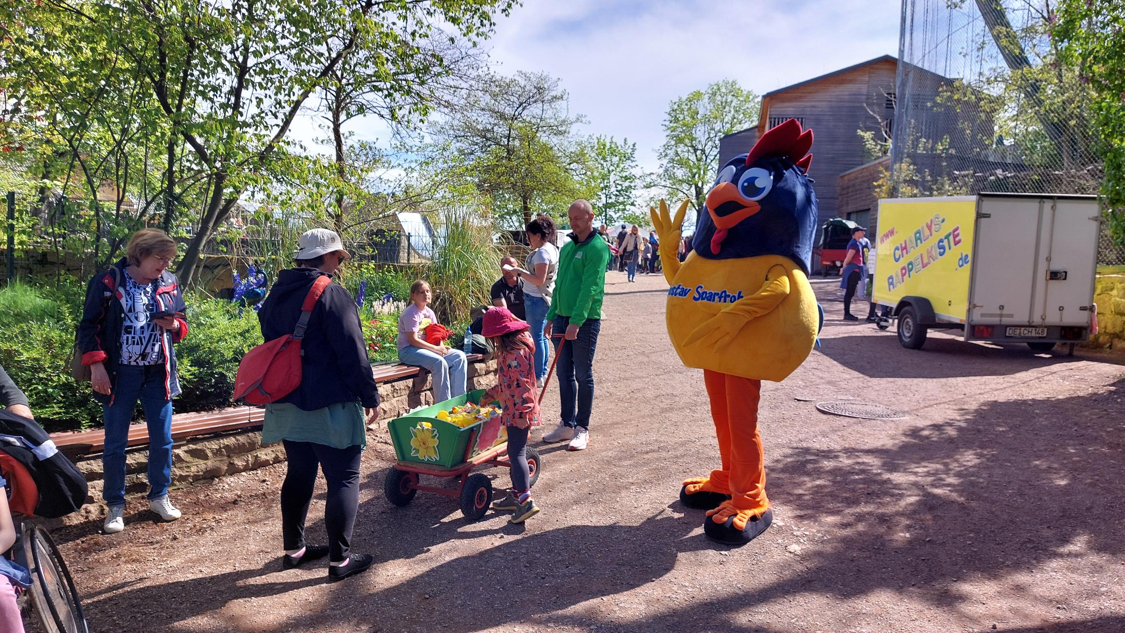Beim Zoobummel begegnete einem Schaf „Pepe“ mit prall gefüllten Kiepen voller Naschereien sowie Jochen der Elefant auf seinem flotten Dreirad und Hahn Gustav Sparfroh von der FROHE ZUKUNFT Wohnungsgenossenschaft eG mit Zoomaskottchen Eric – Das Erdmännchen. Riesige Frühlingsblumen und andere fantastische Figuren auf Stelzen waren ebenfalls im Zoo unterwegs. Bei diversen kommentierten Fütterungen wurden die großen und kleinen Besucherlieblinge näher vorgestellt. An verschiedenen Aktionsständen konnte man zudem Basteln, die unzählige Vielfalt der Eier bestaunen und sein Wissen in einem Quiz ausprobieren oder sich von geschickten Kinderschminkern in ein Wunschtier verwandeln lassen.