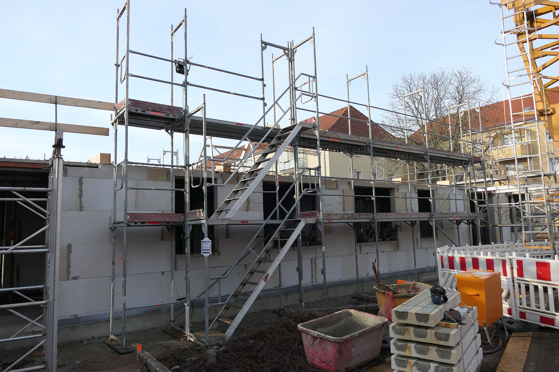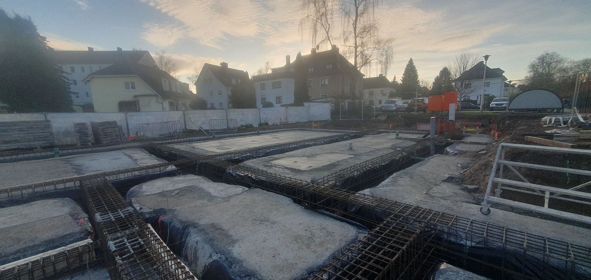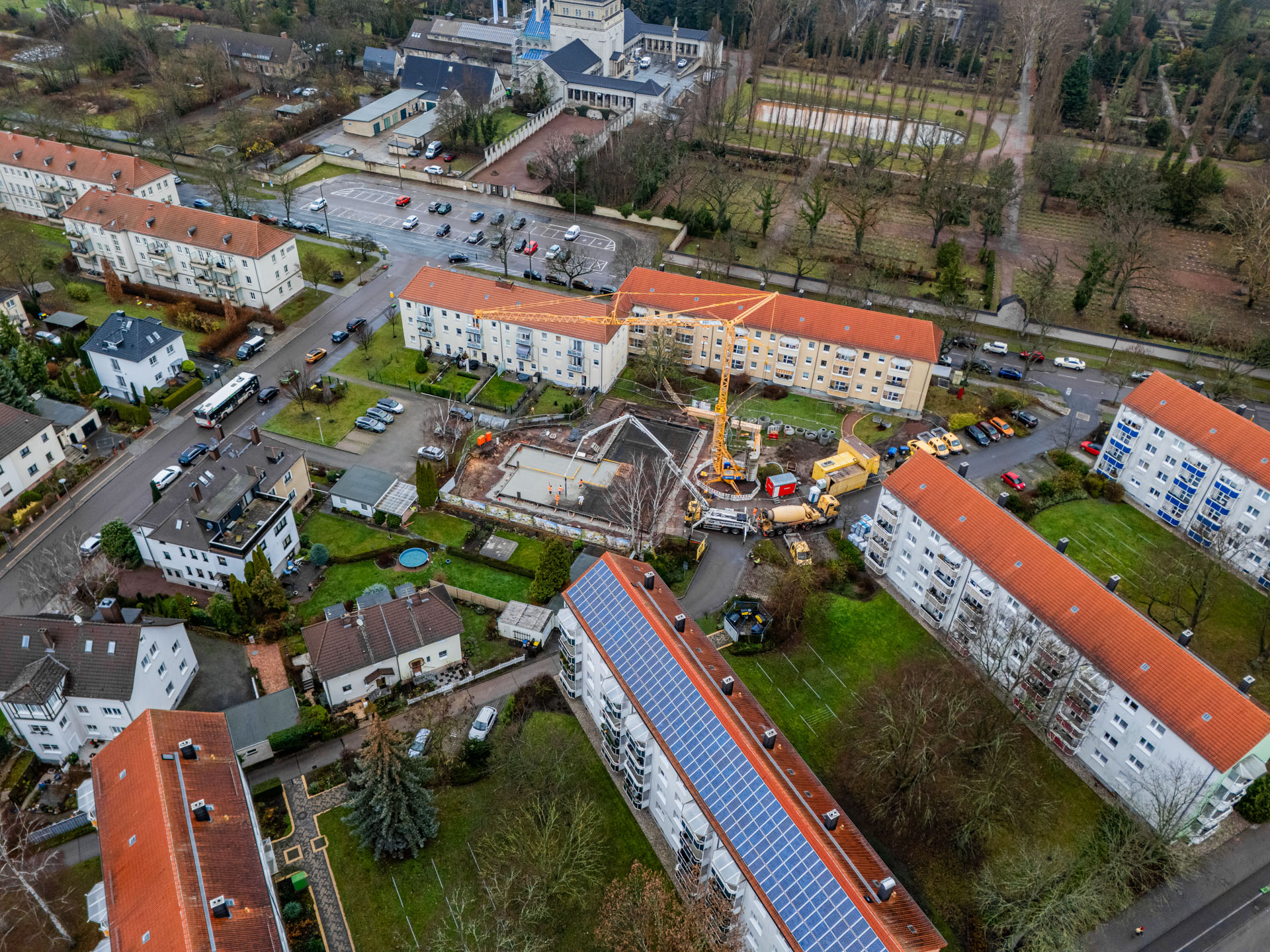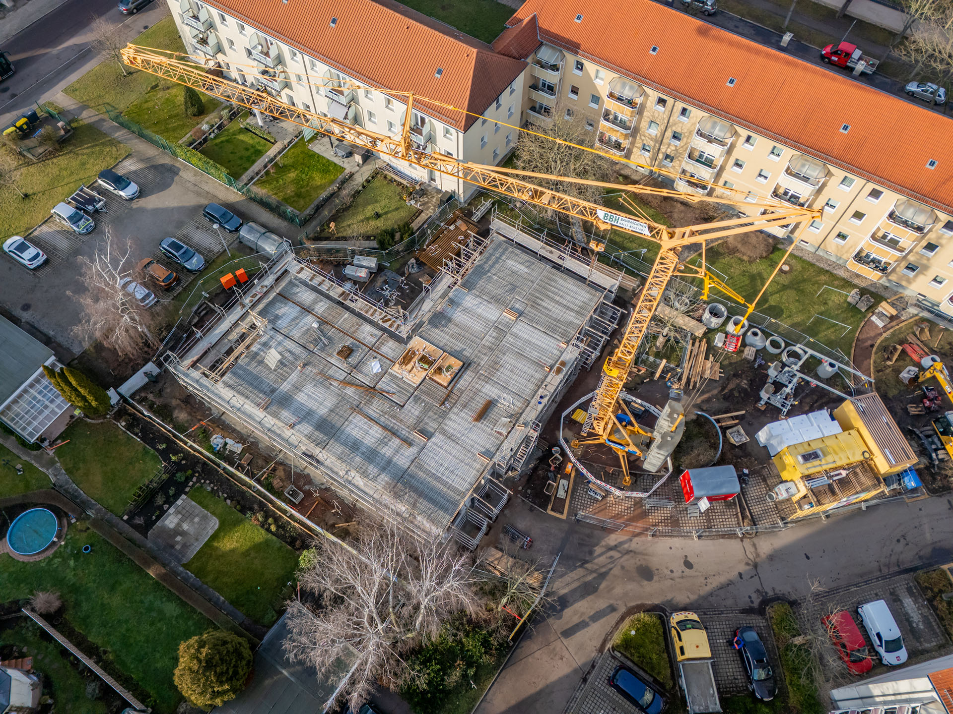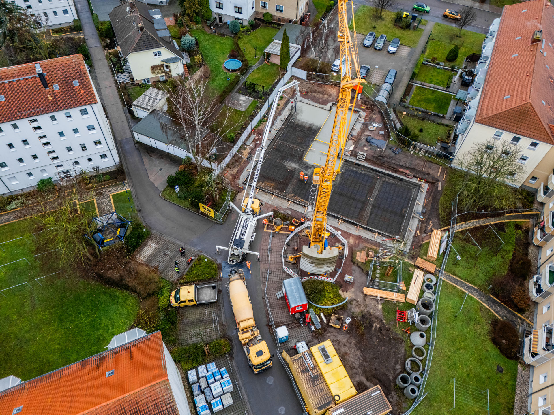 Unser Neubau nimmt zunehmend Form an und wächst stetig weiter. Seit der Grundsteinlegung im November hat sich auf unserer Baustelle viel getan: Der Rohbau ist mittlerweile fertiggestellt und nach nur fünf Monaten intensiver Bauzeit dürfen wir nun das Richtfest feiern. Zu diesem besonderen Anlass kamen am Montag, 28.04.2025 Aufsichtsrat, Vertreter, Repräsentanten anderer Wohnungsunternehmen sowie der Stadt und natürlich die Bauarbeiter zusammen, um feierlich die Richtkrone zu setzen. Unser Vorstand nahm sich im Anschluss viel Zeit für die Anfragen der anwesenden Presse und dem gemeinsamen Austausch mit Gewerken und Gästen.