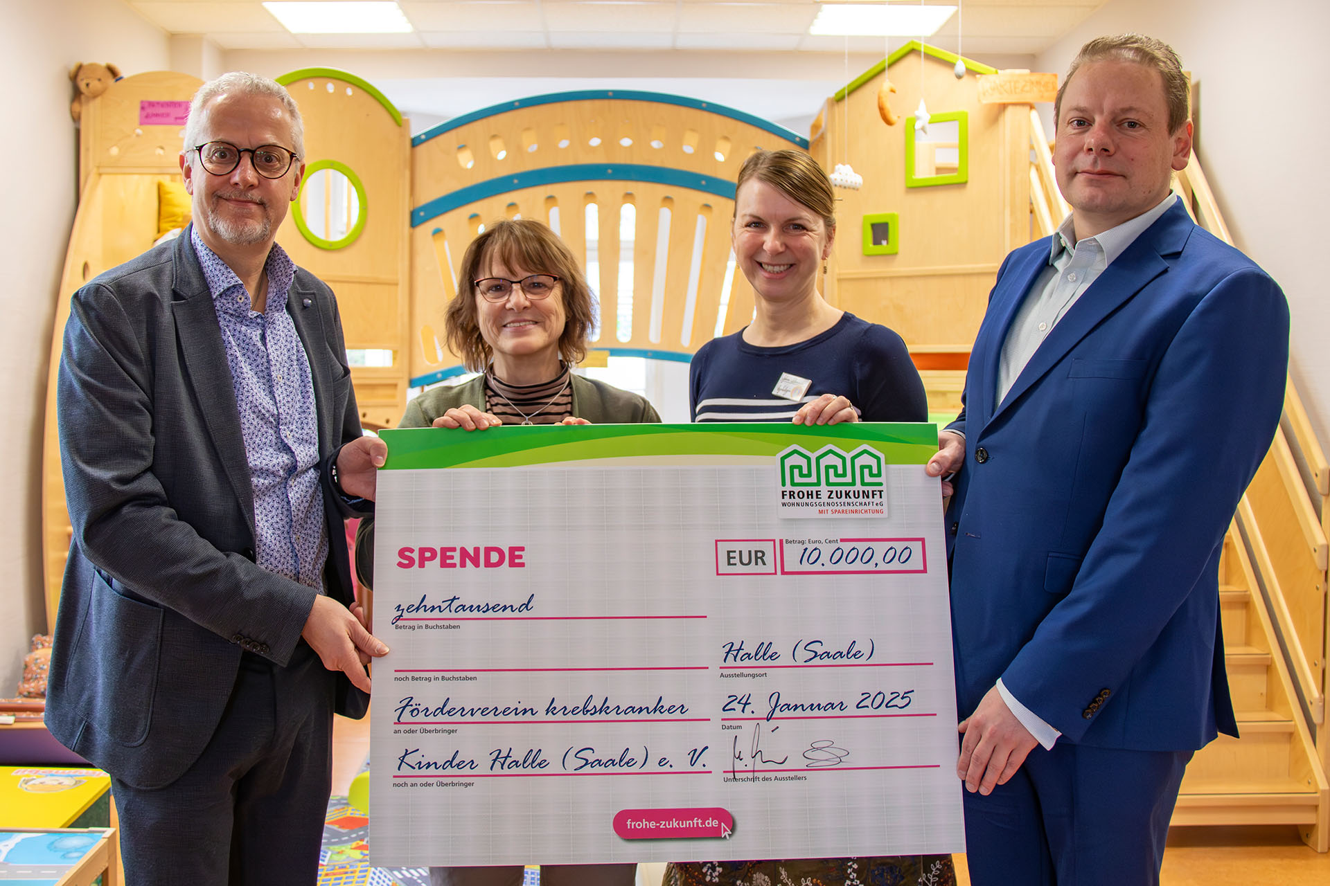 Am 24. Januar 2025 hat die FROHE ZUKUNFT die Spendensumme von 10.000 Euro an den Verein zur Förderung krebskranker Kinder Halle (Saale) e.V. übergeben. Diese Spende ist mehr als eine Zahl – sie ist ein Zeichen der Solidarität und der Dankbarkeit gegenüber dem Verein, der kleinen Helden in ihrer schwersten Zeit zur Seite steht.
