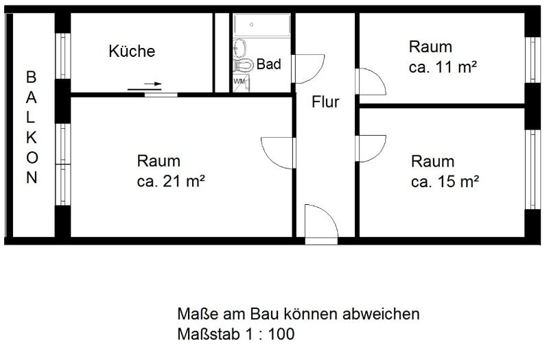 Küche mit Fenster, Waschmaschinenanschluss im Bad, Badewanne, BalkonLagebeschreibung