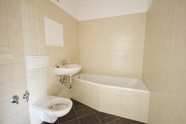 Küche mit Fenster, Waschmaschinenanschluss im Bad, Badewanne, Balkon