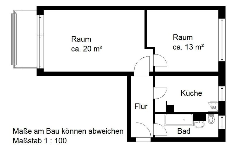 Bad mit Fenster, Küche mit Fenster, Waschmaschinenanschluss in der Küche, Badewanne, Balkon
