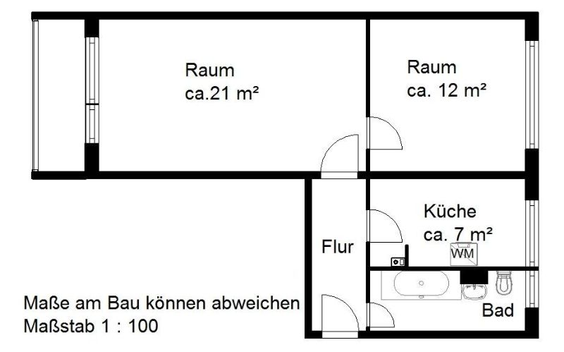 Bad mit Fenster, Küche mit Fenster, Waschmaschinenanschluss in der Küche, Badewanne, BalkonAusstattungsbeschreibung