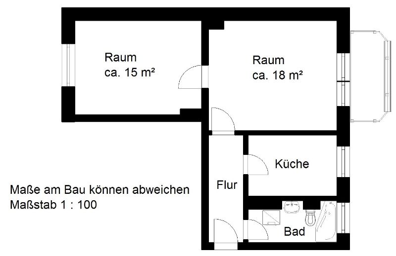 Bad mit Fenster, Küche mit Fenster, Waschmaschinenanschluss im Bad, Badewanne, BalkonAusstattungsbeschreibung