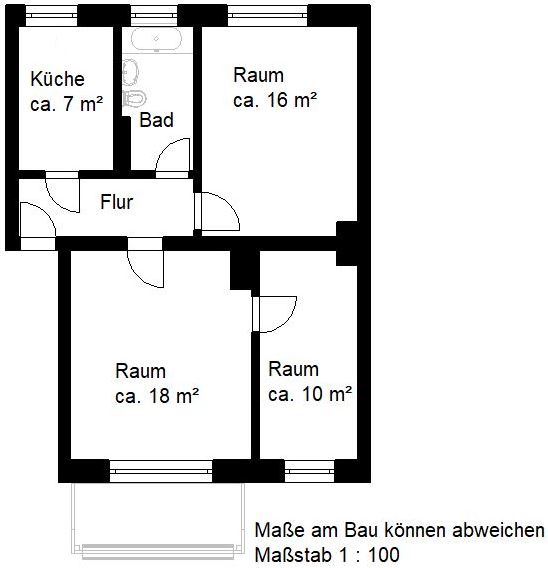 Bad mit Fenster, Küche mit Fenster, Waschmaschinenanschluss in der Küche, Badewanne, BalkonAusstattungsbeschreibung