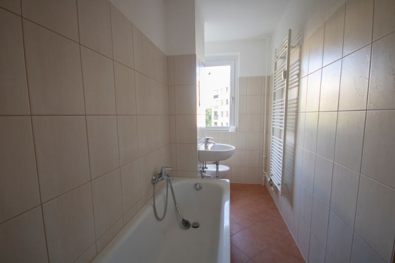 Bad mit Fenster, Küche mit Fenster, Waschmaschinenanschluss in der Küche, Badewanne, Balkon